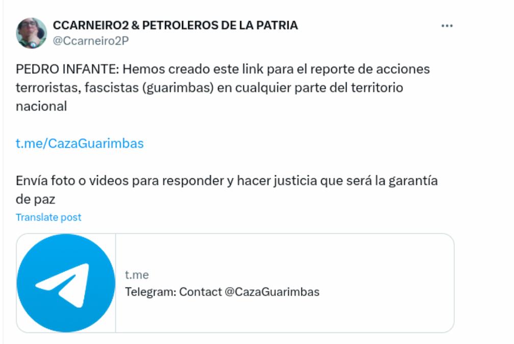 El mensaje no duró más de 15 minutos en línea. Según contó después a una ONG de derechos digitales, recibió llamadas anónimas y, a los dos días, funcionarios del Sebin lo visitaron en su casa. No lo detuvieron, pero le advirtieron que “el sistema” lo había identificado como promotor de violencia.