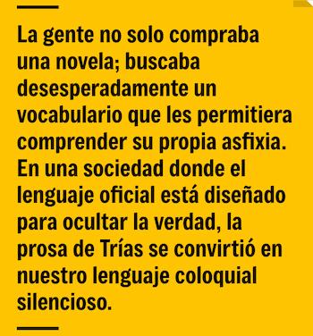 En una sociedad donde el lenguaje oficial está diseñado para ocultar la verdad, la prosa de Trías se convirtió en nuestro lenguaje coloquial silencioso. Todos éramos supervivientes de un colapso que nadie podía nombrar, y encontrábamos los contornos de nuestra propia ruina en su ficción.