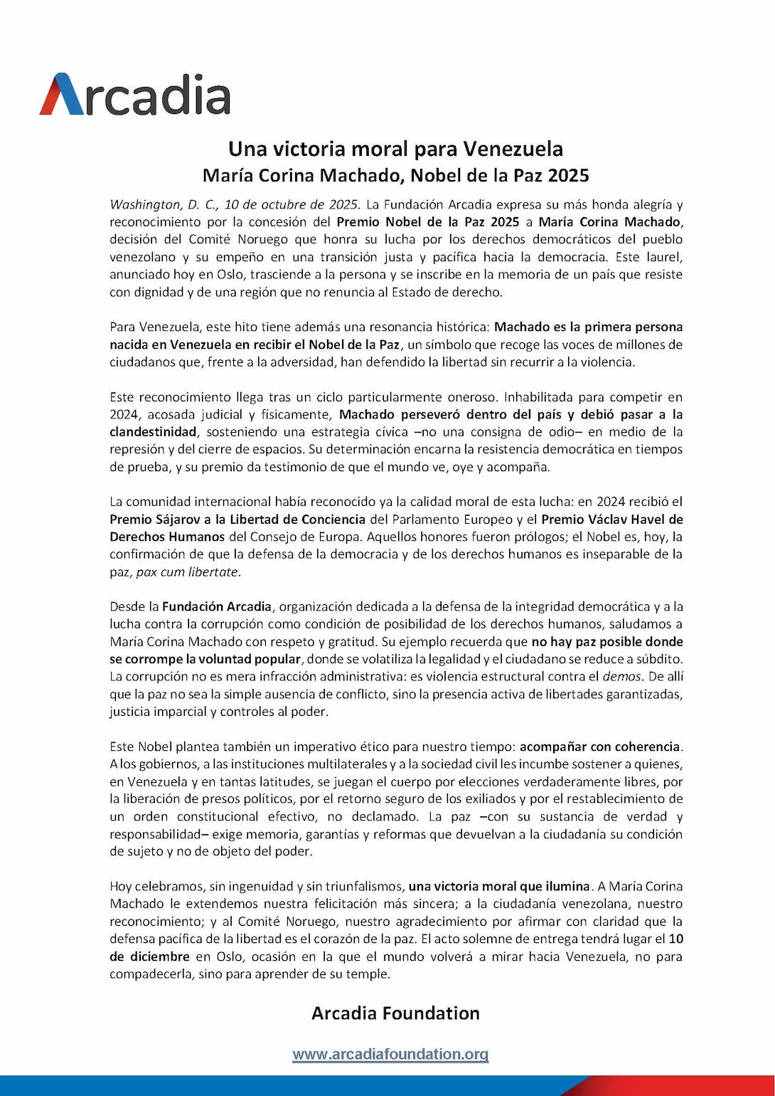 Arcadia expresa su “más honda alegría y reconocimiento” por el laurel concedido a Machado, al que define como una distinción que “trasciende a la persona” y se inscribe en la memoria de un país entero. El comunicado se propone tanto como celebración —“una victoria moral que ilumina”— como declaración de principios: la paz no es una tregua sin contenido, sino una arquitectura institucional que asegura libertades, justicia imparcial y controles al poder. El premio, afirma, honra “su lucha por los derechos democráticos del pueblo venezolano y su empeño en una transición justa y pacífica hacia la democracia”.