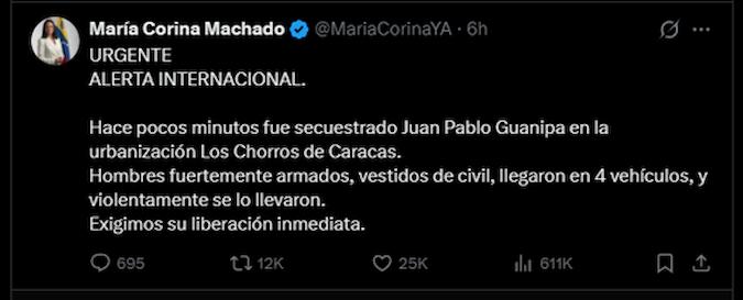 A las diez de la noche, Juan Pablo Guanipa fue interceptado en la urbanización Los Chorros, en Caracas, por hombres armados, vestidos de civil y sin identificación visible, denunciaron su familia y dirigentes opositores. Lo sacaron a la fuerza. Horas después, la Fiscalía intentó encuadrar el episodio en una narrativa administrativa: revocatoria de medida cautelar, protección del proceso penal, sustitución por arresto domiciliario. Sin detallar qué norma se habría quebrantado. Sin exhibir la orden judicial en el momento del operativo. Sin explicar por qué una supuesta decisión procesal se ejecutó como una captura irregular.