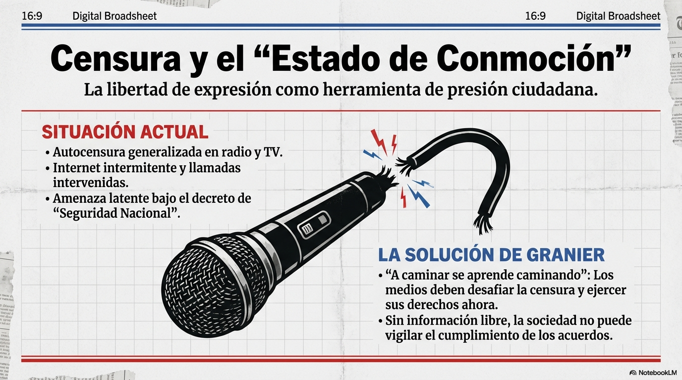 Es indispensable levantar el Estado de conmoción. Los medios deben quitarse el miedo y ejercer sus derechos. Decir lo que están viendo y lo que está ocurriendo. Abrir sus canales a la oposición. La radio y la televisión se autocensuran, Internet es intermitente y todos tienen la amenaza del decreto de Estado de Conmoción que autoriza al gobierno violar las garantías ciudadanas “por razones de seguridad nacional”. La única manera de restablecer la libertad de expresión es ejerciéndola. A caminar se aprende caminando.