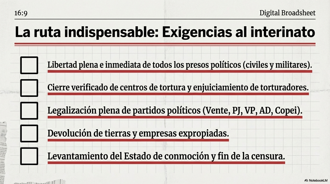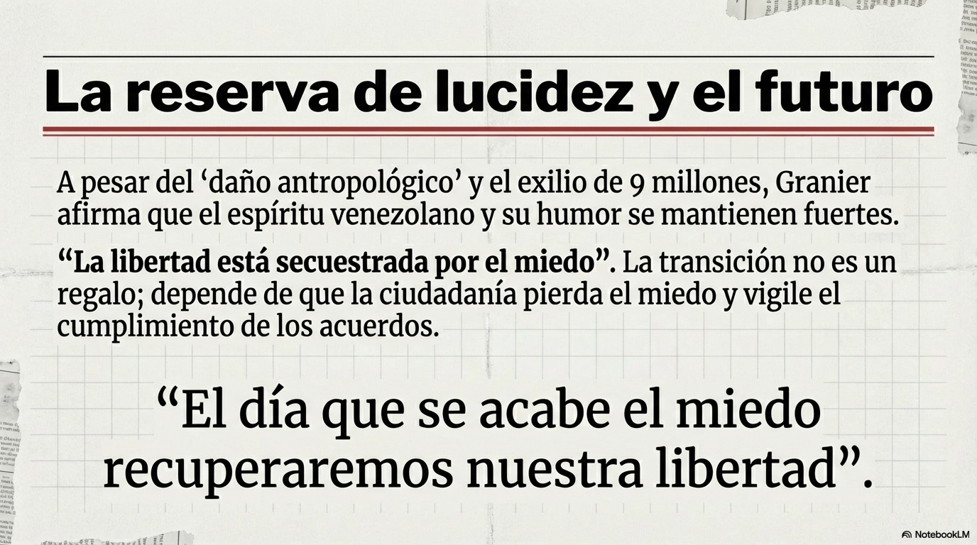 Desde esa premisa, Granier despliega una interpretación amplia: cuestiona la lentitud de los cambios, reclama claridad sobre los términos del acuerdo entre Caracas y Estados Unidos, advierte sobre el peso aún intacto de estructuras militares y de seguridad, y sitúa a María Corina Machado como el principal liderazgo civil en la disputa por la reconstrucción democrática. La conversación cruza petróleo, soberanía, Fuerza Armada, censura, reconciliación sin impunidad y el riesgo de que la salida de Maduro no cierre el ciclo autoritario sino que inaugure otra fase de control bajo nuevos equilibrios.