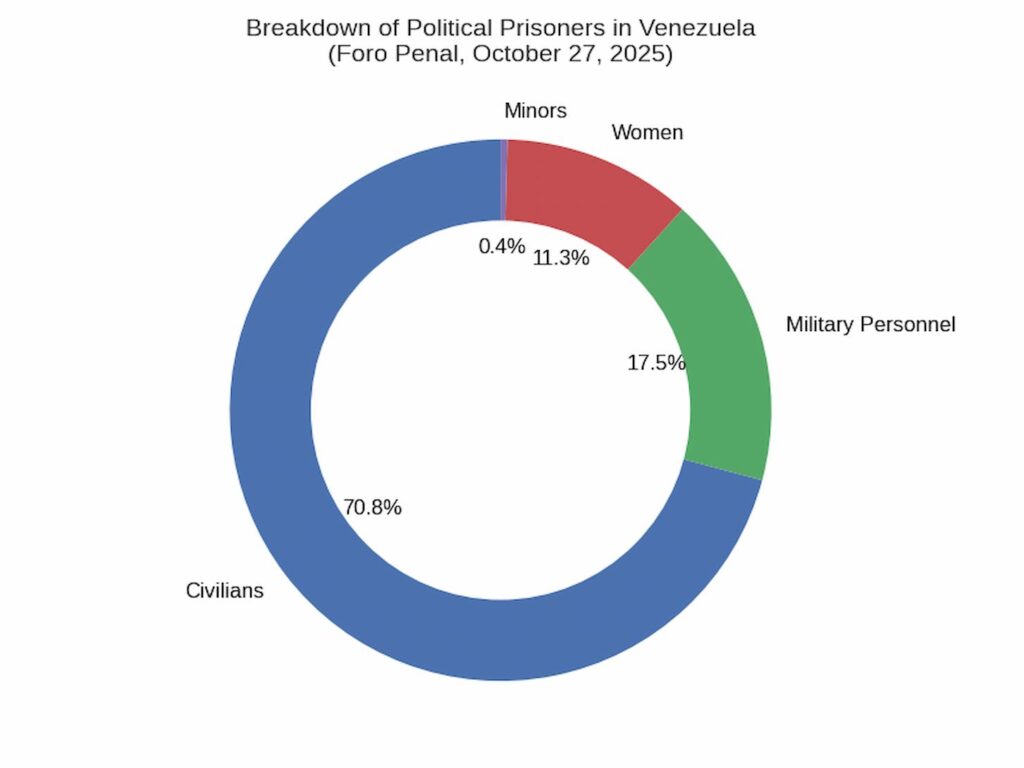 According to Foro Penal, as of late October 2025, Venezuela holds 875 political prisoners: 702 civilians and 173 military personnel. Among them are 112 women and four minors. The figures reveal a system that no longer relies on selective repression but on mass incarceration as a tool of governance.